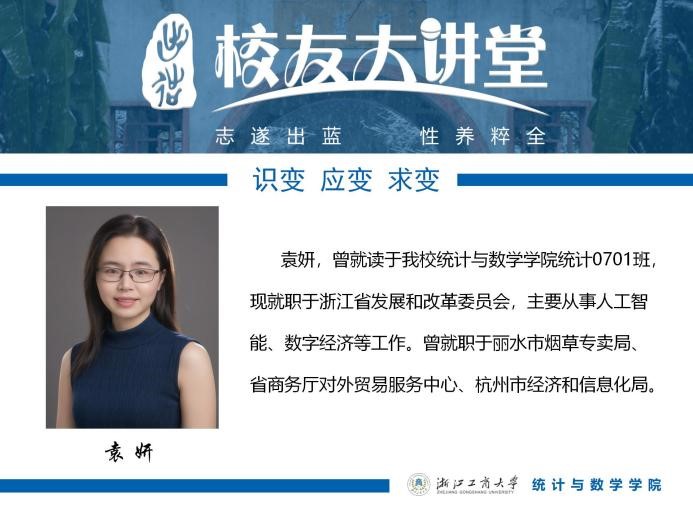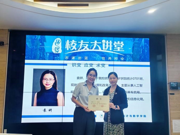 2025年9月13日下午,统计与数学学院邀请就职于浙江省发展和改革委员会、统计0701班校友袁妍担任“出蓝”校友大讲堂主讲人。学院党委书记陈钰芬、学院党委副书记沈绍伟以及23级、24级本科生代表参加讲座。