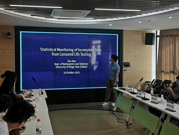 2025年10月16日下午,奥塔哥大学肖逊博士应邀来我校开展以“Statistical Monitoring of Incomplete Data from Censored Life Testing”为主题的学术讲座,本次讲座在综合楼644会议室举行,由统计与数据科学学院徐安察教授主持。