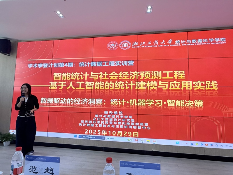2025年10月29日下午,由统计与数据科学学院、经济运行态势预警与政策推演实验室、统计数据工程与应用协同创新中心和之江大数据统计研究院,联合举办的“学术攀登计划”第四期统计数据工程实训营,在我校现教中心102教室顺利开展了学员实训成果报告会。