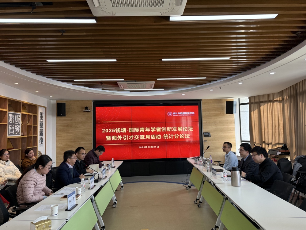 2025年12月25日下午,2025钱塘·国际青年学者创新发展论坛统计分论坛在浙江工商大学下沙校区综合楼644会议室成功举办。本次分论坛邀请了来自英国莱斯特大学的李文涛老师、清华大学博士后刘希原博士,以及中国社会科学院大学冯卓博士三位青年学者作专题报告,由统计学院院长程开明主持,党委书记陈钰芬、副院长张荣茂、学术副院长朱贺、学术副院长周布、系所主任及学院师生代表参会。